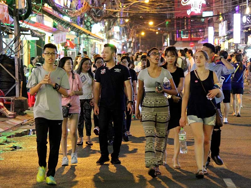 Người dân và du khách thoải mái dạo bộ ở phố đi bộ Bùi Viện trước ngày khai trương. Ảnh: HOÀNG GIANG