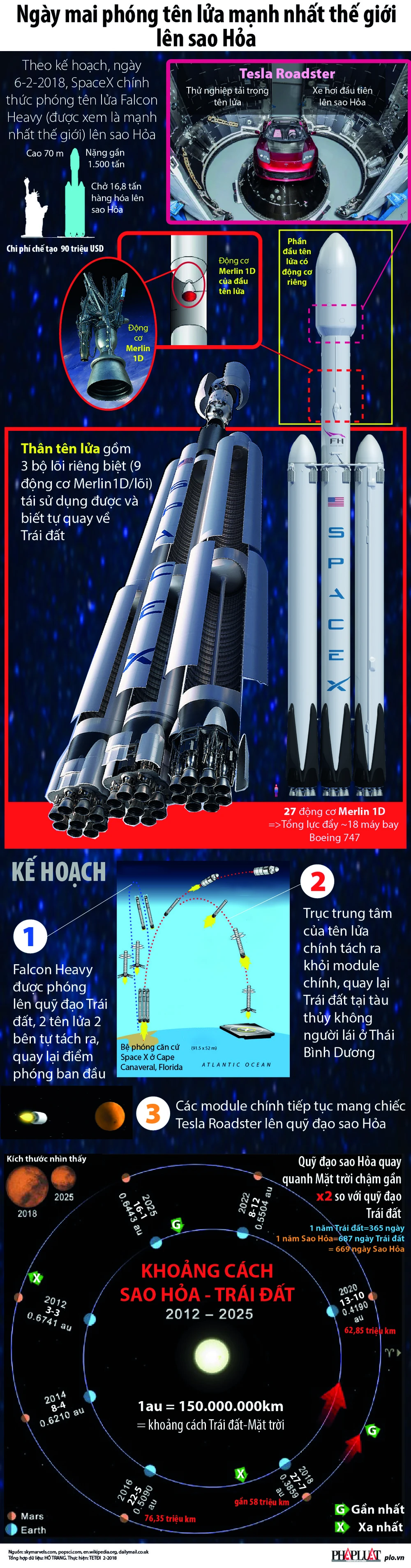 (PLO)- Ngày mai, 6-2-2018, tên lửa mạnh nhất thế giới Falcon Heavy do hãng SpaceX (Mỹ) sản xuất chính thức được phóng lên sao Hỏa.