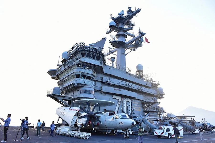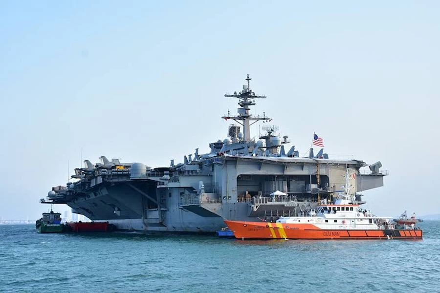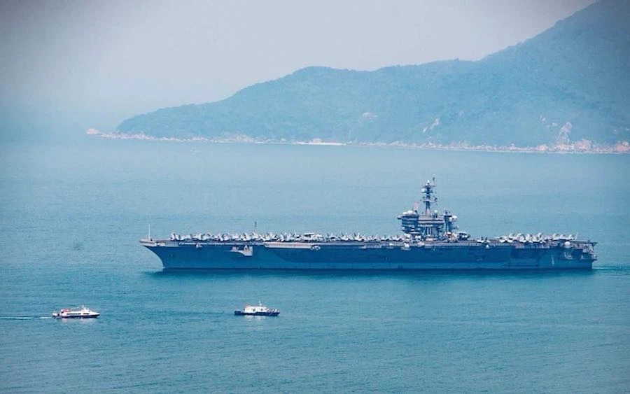Tàu sân bay USS Carl Vinson mang theo khoảng 6.000 sĩ quan, thủy thủ neo ngoài cửa ngõ vịnh Đà Nẵng trong sự chào đón thân thiện của người dân TP. Điều này đánh dấu lần đầu tiên một tàu sân bay Mỹ tới thăm Việt Nam trong 40 năm qua.