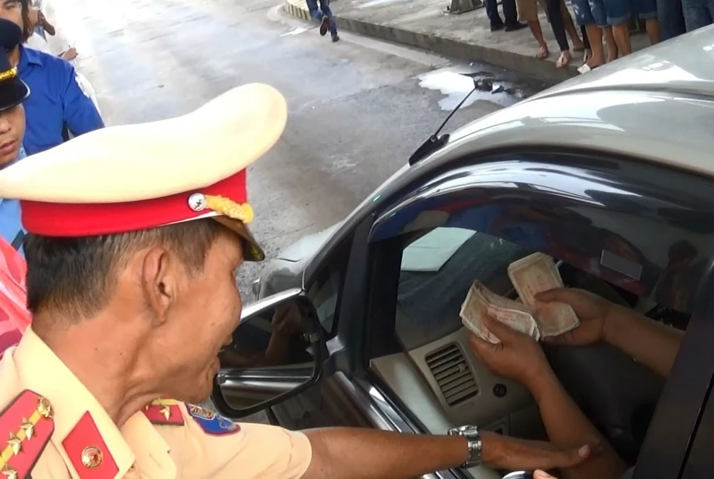Tài xế dùng tiền lẻ mua phí qua trạm BOT tuyến tránh Biên Hòa. Ảnh: VH
