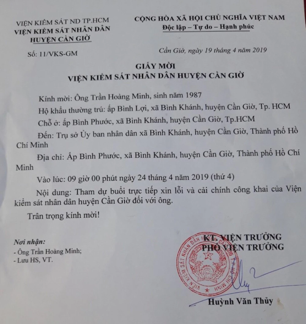 Giấy mời vừa được công an xã chuyển đến anh Minh vào sáng nay 23-4. Người ký giấy mời là Phó Viện trưởng VKSND huyện Cần Giờ Huỳnh Văn Thuỷ. Tại thời điểm giải quyết vụ án, ông Thuỷ là viện trưởng VKS huyện.