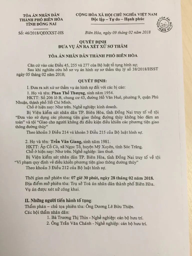 Bị cáo Phan Thế Thượng (63 tuổi, ngụ Đồng Nai) bị truy tố về hai tội: Đưa vào sử dụng các phương tiện giao thông đường thủy không đảm bảo an toàn và giao cho người không đủ điều kiện điều khiển các phương tiện giao thông đường thủy. Bị cáo Trần Văn Giang (36 tuổi, ngụ Sóc Trăng) bị truy tố về tội vi phạm quy định về điều khiển phương tiện giao thông đường thủy.