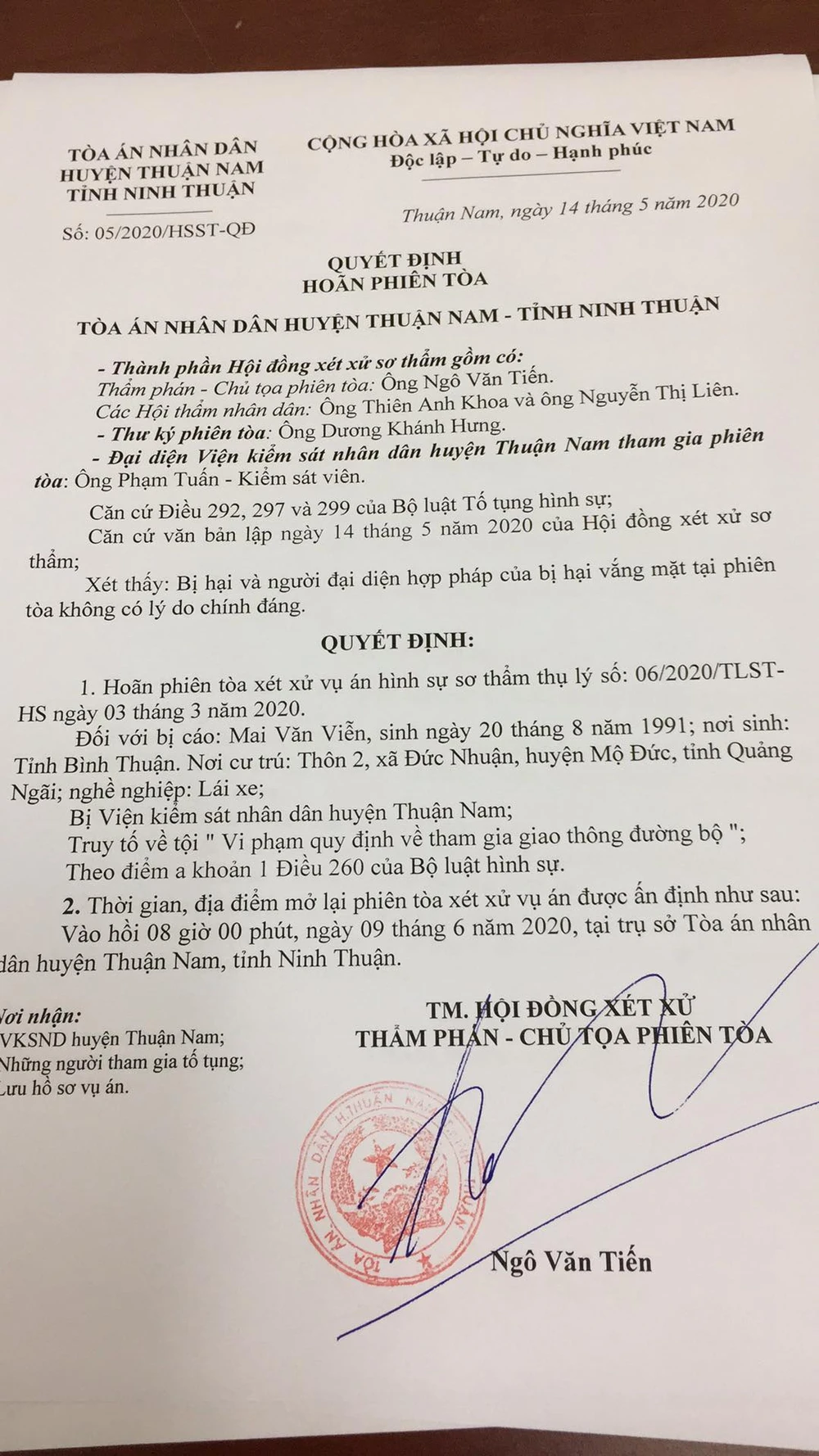 Ngày mai, 9-6, TAND huyện Thuận Nam (Ninh Thuận) xử sơ thẩm vụ án vi phạm quy định về tham gia giao thông đường bộ đối với bị cáo Mai Văn Viễn (sinh năm 1991, ngụ Quảng Ngãi).