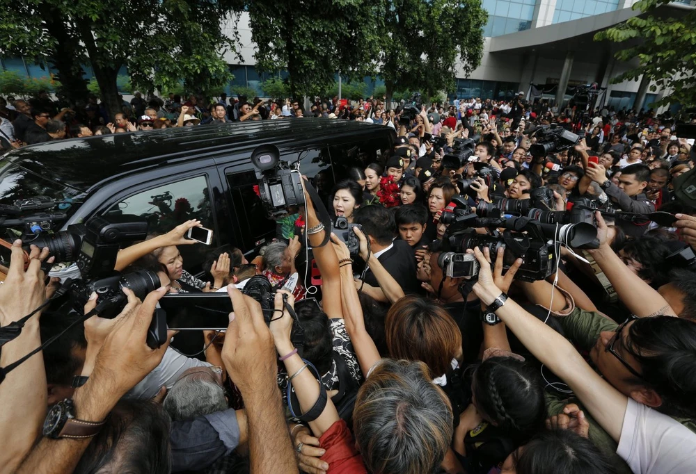 Bà Yingluck giữa "biển người" ủng hộ vào ngày biện hộ cuối cùng trước tòa trong vụ kiện chương trình trợ giá gạo quốc gia. Ảnh: NATION