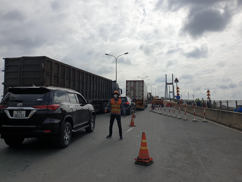 Sáng sớm ngày 2-7, nhà thầu sửa chữa khe co giãn trên cầu Phú Mỹ đã có mặt từ sớm để triển khai thi công, khắc phục sự cố.