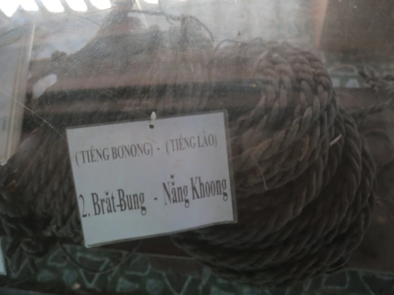 Dẫn chúng tôi đến kho “báu vật” - bộ dụng cụ săn voi của vua voi Ama Kông để lại cho ông. Chỉ vào sợi dây da dùng trong săn bắt voi, Khăm Phết nói, bộ dây da này được bện từ da của bảy con trâu mới thành. Bên cạnh là chiếc tù và đã cũ, một bộ quần áo bằng vỏ cây rừng và nhiều vũ khí bằng kim loại.