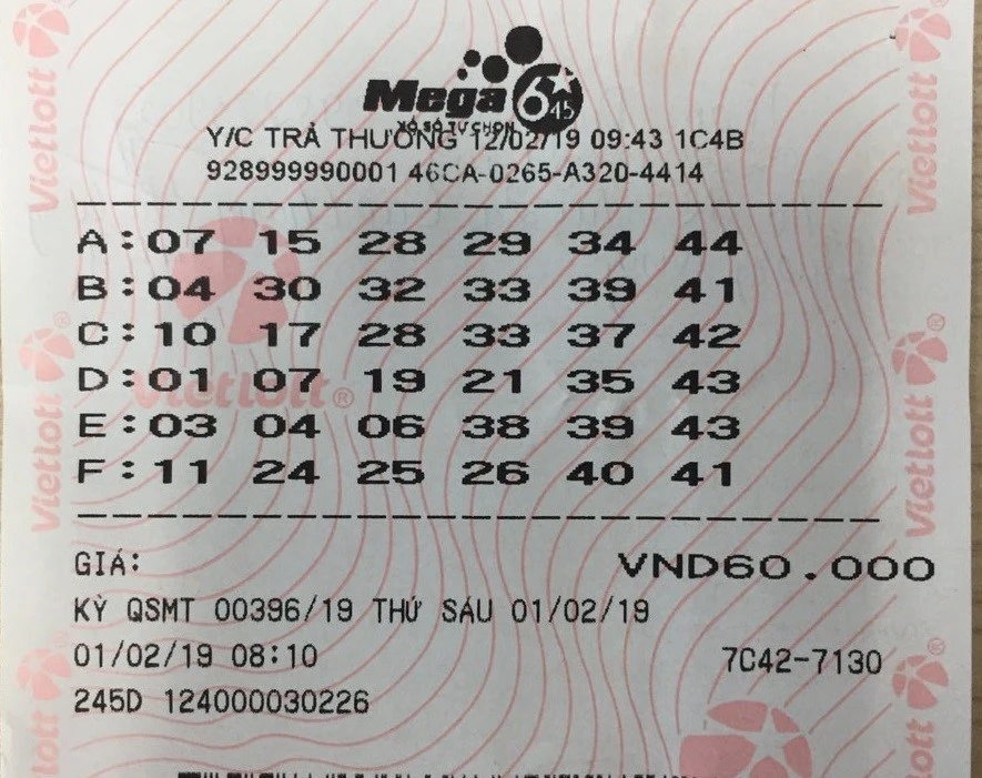 Qua kiểm tra trên hệ thống kỹ thuật và hồ sơ kèm theo, Vietlott xác định chiếc vé đã trúng giải Jackpot sản phẩm Mega 6/45 kỳ QSMT thứ 396 ngày 1-2-2019 với trị giá 25.129.665.334 đồng (chưa khấu trừ thuế thu nhập cá nhân theo quy định nhà nước).