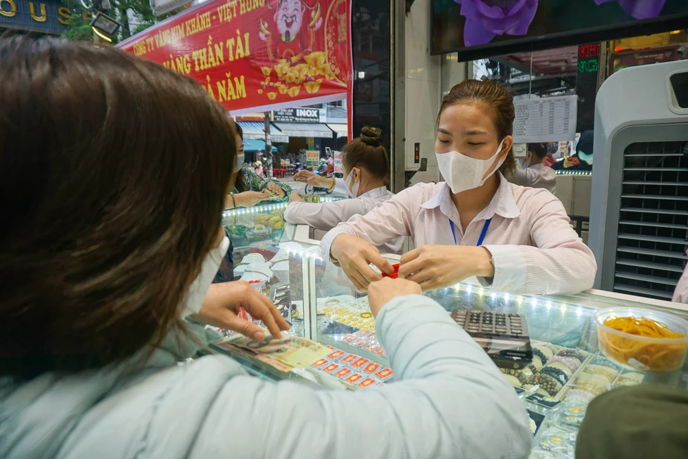 Lượng người ra vào tiệm vàng đông, nhân viên các tiệm vàng phải điều phối để tránh ảnh hưởng đến giao thông khu vực. Ảnh: BT.