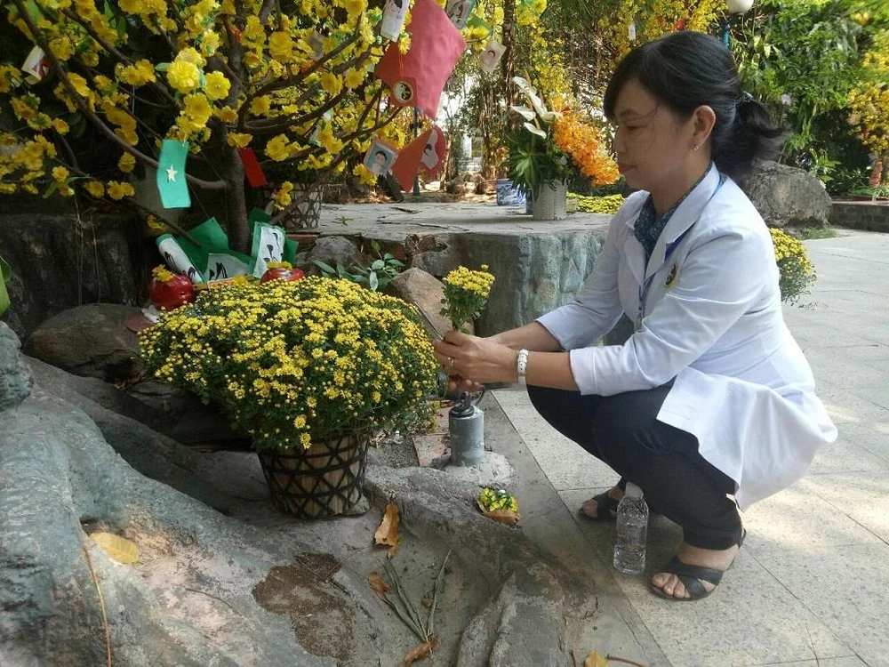 Dược sĩ Trần Thị Thanh Hương đang chăm chút những chậu cúc đặt trước miếu. Ảnh: TRÚC PHƯƠNG