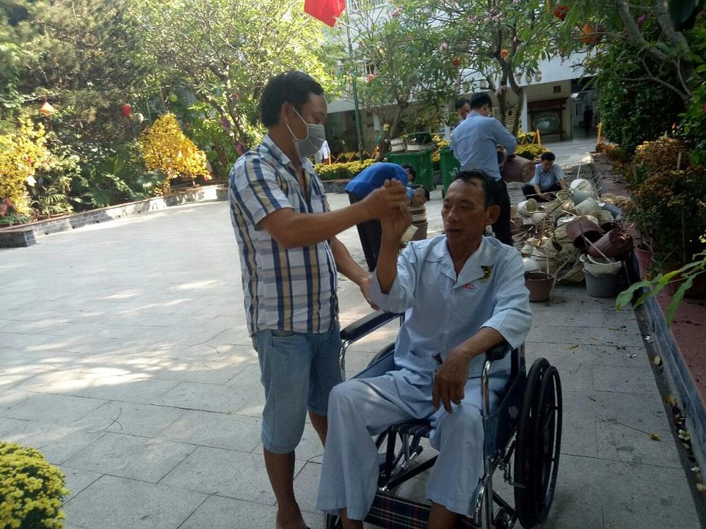 Một bệnh nhân được người thân đưa ra khuôn viên gần miếu tập vật lý trị liệu. Ảnh: TRÚC PHƯƠNG