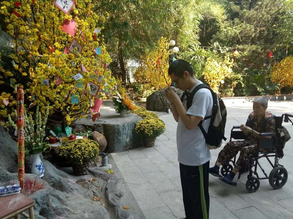 Nguyễn Châu Ngọc Phước (quận 10, TP.HCM) đang cùng mẹ thắp nhang trước miếu thờ. Phước khấn nguyện cho bệnh tình của mẹ anh nhanh chóng thuyên giảm. “Không gian cây xanh quanh miếu thờ giúp người bệnh cảm thấy dễ chịu hơn trong ngày nắng nóng, đây cũng nơi người bệnh và người thân thường đến để trò chuyện, tập luyện và cả thắp hương cầu mong được đức danh y phù hộ" - anh Phước chia sẻ.