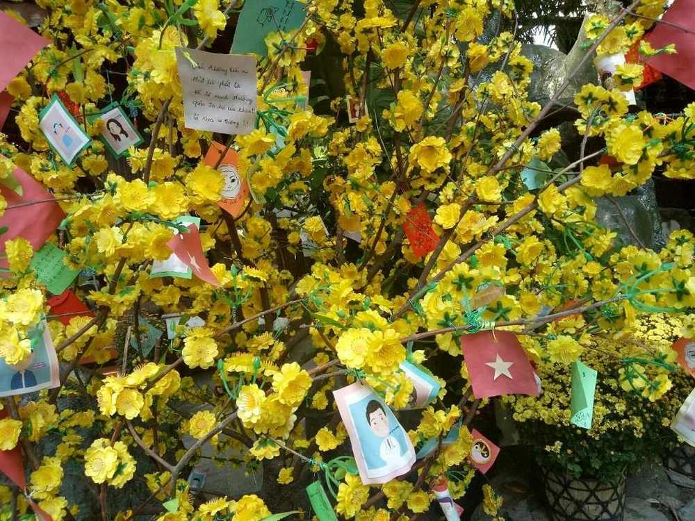 Cây mai vàng treo những lời chúc của tập thể y bác sĩ, nhân viên Viện Y dược học dân tộc TP.HCM. Ảnh: TRÚC PHƯƠNG