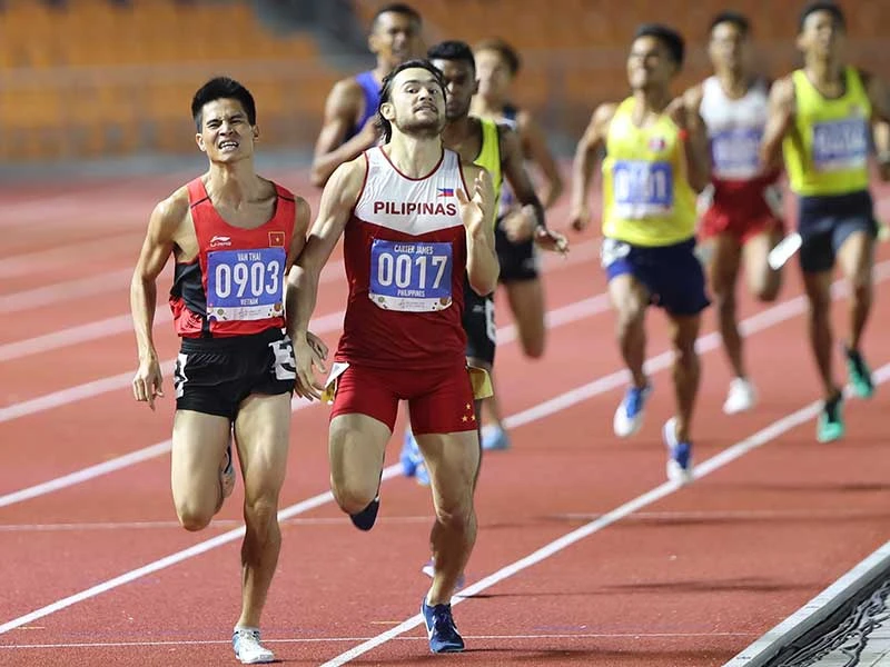 Khi các VĐV vào đoạn 100 m cuối, chân chạy người Nam Định bắt đầu tung nước rút thu hẹp khoảng cách hơn 10 m so với James và bất ngờ vượt qua đối thủ giành chiến thắng sau 1’49”91. Trước khi vọt qua mức, hai VĐV đã xảy ra va chạm dẫn đến kết quả bất lợi đối với Cater James. Trong lúc VĐV của Việt Nam ăn mừng chiến thắng, màn hình SVĐ Athletics New Clark City chiếu chậm cảnh va chạm giữa Thái và James, cùng lúc đó hàng chục ngàn khán giả Philippines đồng thanh la ó phản ứng vì cho rằng VĐV Việt Nam chơi xấu VĐV của mình.