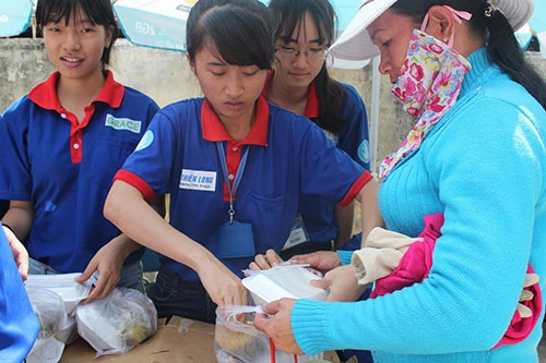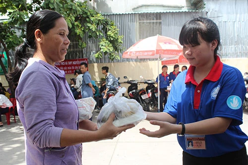 Cô Thanh (Bình Dương) chia sẻ: “Thật may vì hôm nay tôi được nhận suất cơm miễn phí này từ các em sinh viên tham gia TSMT, chứ trưa qua mẹ con tôi phải tốn đến 45 ngàn cho một phần cơm và 20 ngàn cho một chai nước, tốn kém lắm, mà chúng tôi lại từ xa lên nữa”. Ảnh Lê Thoa