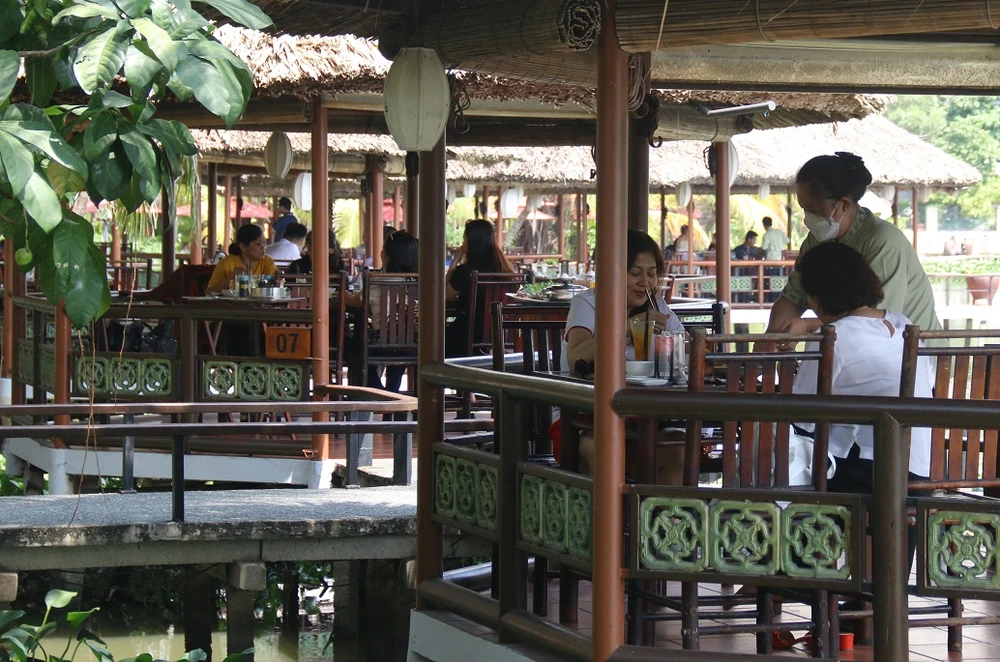 Nhân viên nhà hàng trong Khu du lịch Văn Thánh đeo khẩu trang khi phục vụ. Ảnh: KHÁNH CHI