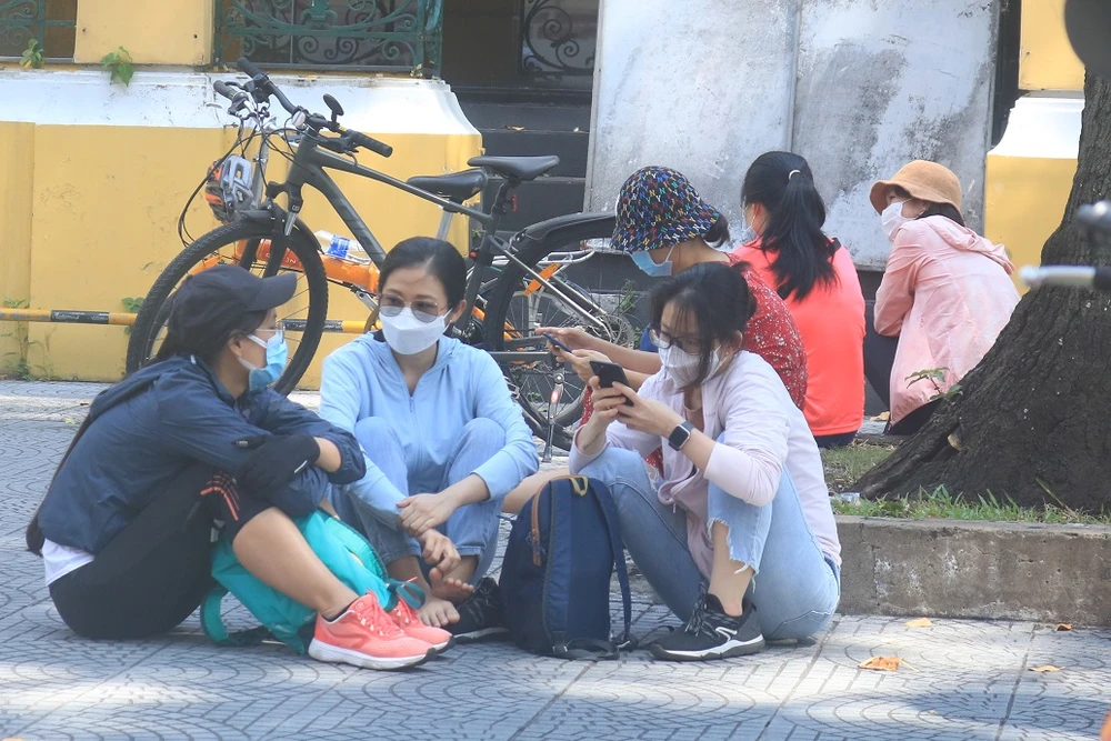 Các gia đình ngồi giãn cách để nghỉ ngơi ăn uống vào buổi trưa. Ảnh: THẢO PHƯƠNG