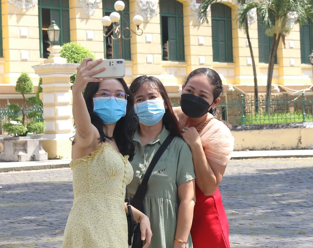 Chụp hình vẫn đeo khẩu trang. Ảnh: THẢO PHƯƠNG
