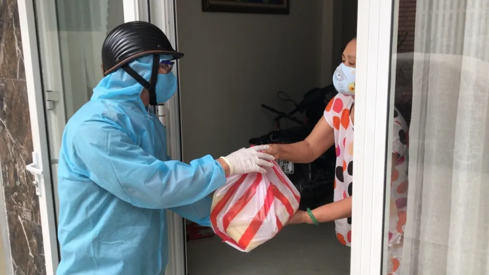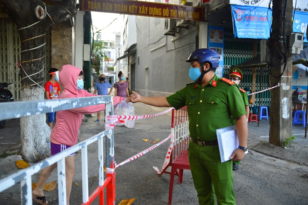 Thượng úy Đặng Minh, Công an phường Hòa Thuận Tây (quận Hải Châu), giao thức ăn cho người dân trong khu cách lý y tế.