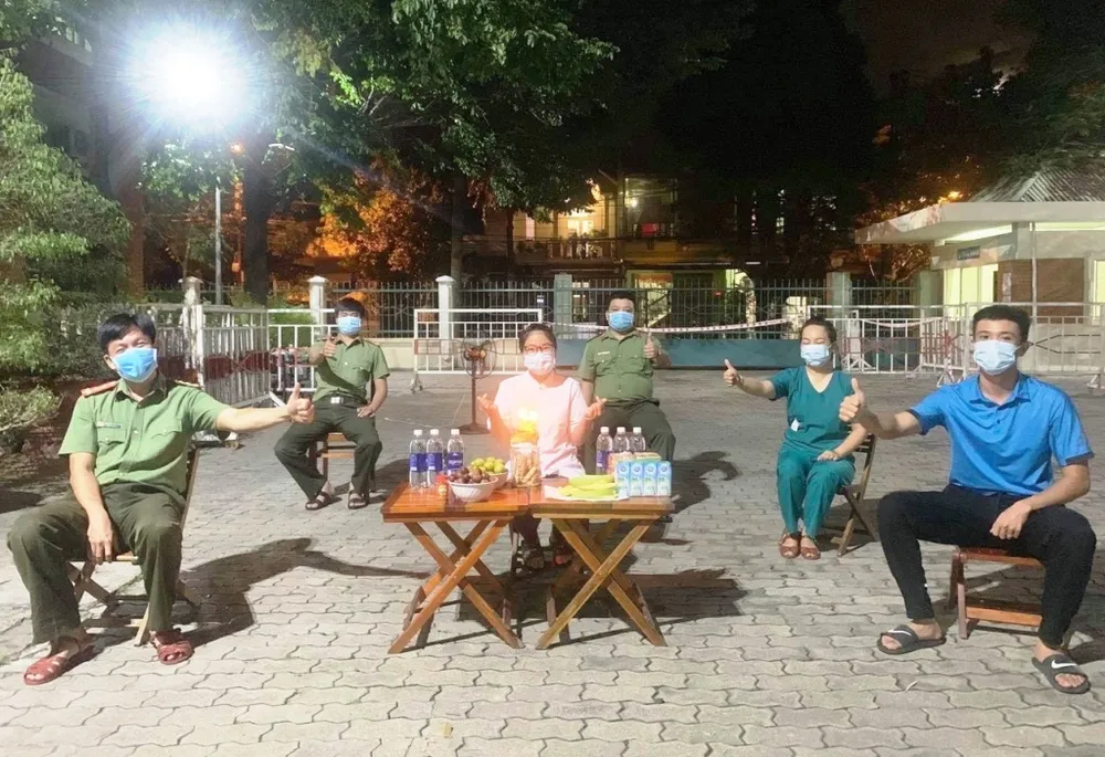 Trung úy, y sĩ Nguyễn Thị Thu Thành phải làm nhiệm vụ theo dõi sức khỏe cho cán bộ, chiến sĩ bị cách ly tại quận Cẩm Lệ. Chị cùng đồng đội mừng sinh nhật trong khu cách ly.