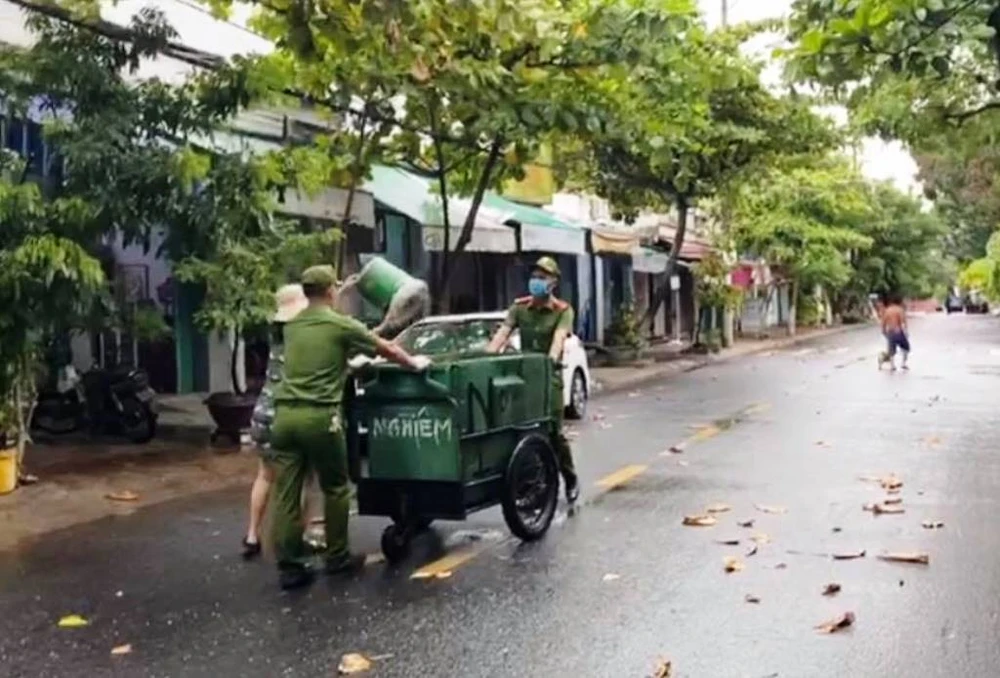 Lực lượng công an phường Thanh Khê Tây (quận Thanh Khê) cùng người dân dọn rác trong khu cách ly y tế.