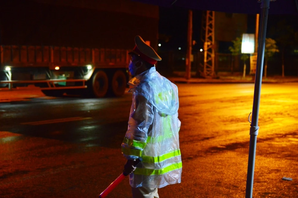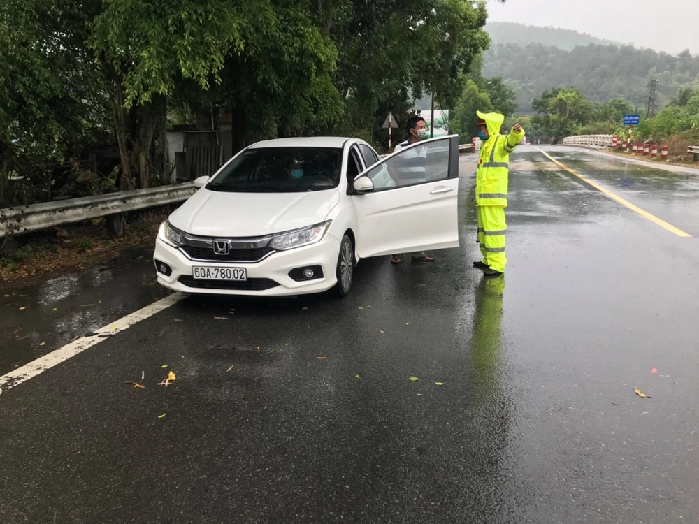 Lực lượng CSGT trạm Cửa ô Hòa Hiệp đội mưa kiểm tra người vào Đà Nẵng tại chốt kiểm dịch COVID-19 ở chân đèo Hải Vân.