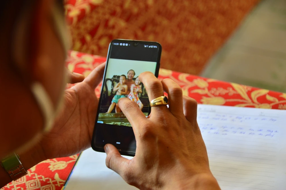 Đại úy Tô Đức Anh, Công an phường Nại Hiên Đông (quận Sơn Trà), từ khi có dịch đến giờ, anh không về nhà, nhớ người thân lấy điện thoại ra xem hình gia đình.