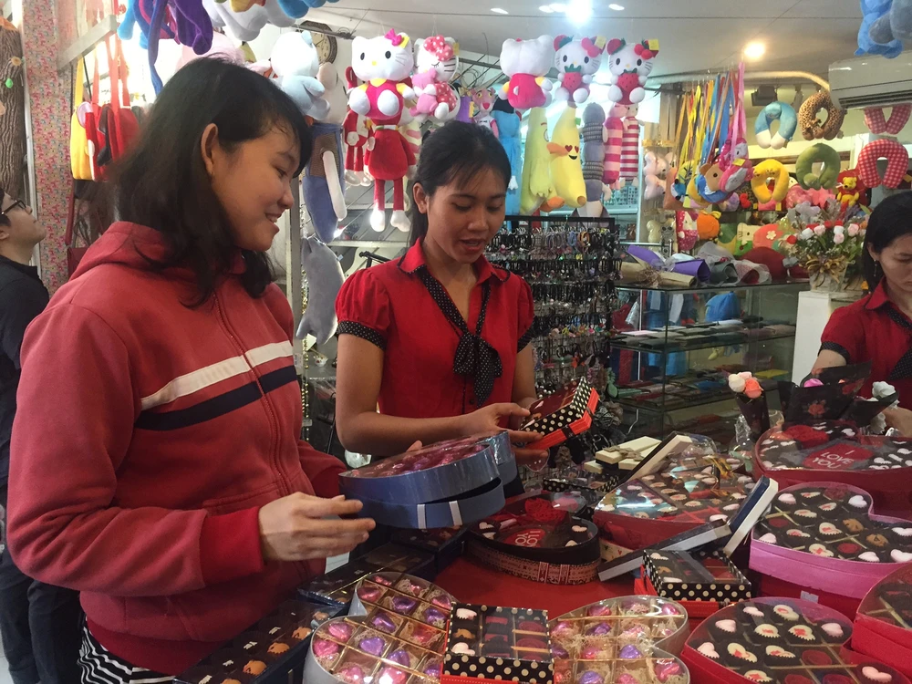 Đại diện hệ thống cửa hàng quà tặng Hana cho biết lễ Valentine thì sản phẩm chủ lực vẫn là sôcôla. Thông thường khách mua hộp sôcôla lớn làm quà tặng, hoặc hộp sôcôla nhỏ đi kèm gấu bông hoặc các sản phẩm khác.