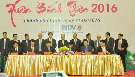Tại hội nghị, lãnh đạo trung ương và địa phương chứng kiến lễ ký năm thỏa thuận đầu tư vào tỉnh Nghệ An với tổng giá trị hơn 61 tỉ đồng. Ảnh: ĐĂC LAM