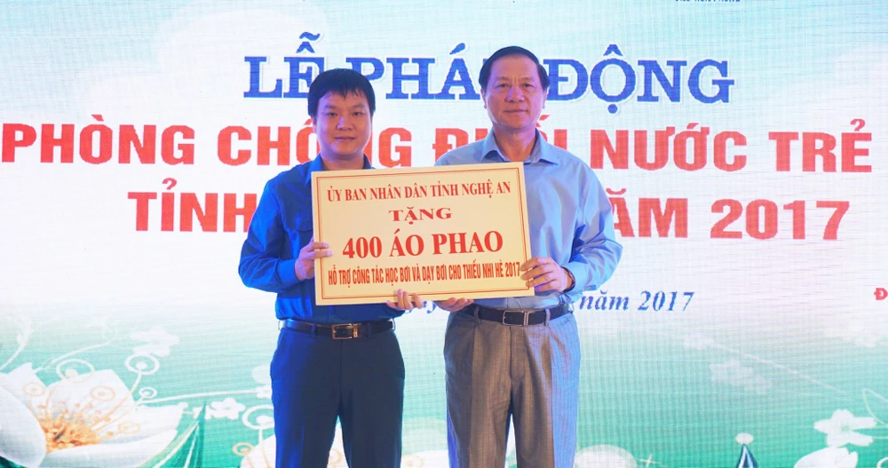Ông Lê Minh Thông (phải) - Phó Chủ tịch UBND tỉnh Nghệ An trao tặng 400 áo phao tại "Lễ phát động chương trình phòng chống đuối nước cho trẻ em năm 2017”.