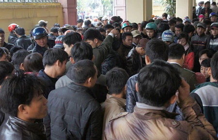 Từ mờ sáng, nhiều người đã mang theo bánh, nước đến sắp hàng để mong sớm làm được hộ chiếu, giấy thông hành để sang Lào tìm kiếm việc làm và đi xuất khẩu lao động các nước. Do lượng người tăng đột biến, Công an TP Vinh phải huy động toàn bộ lực lượng Công an phường Trường Thi, lực lượng trật tự đô thị đến bảo vệ trật tự và tránh ách tắc giao thông trước Phòng Quản lý Xuất nhập cảnh.