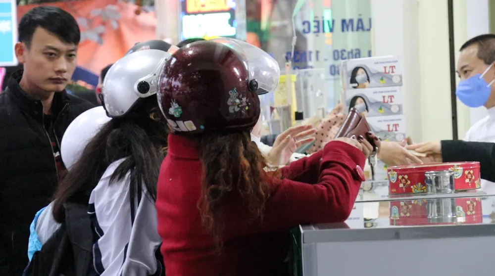 Người dân ở Nghệ An chen chúc mua khẩu trang tại hiệu thuốc bên đường Nguyễn Phong Sắc (TP Vinh) với giá 200.000 đồng hộp khẩu trang 50 cái.