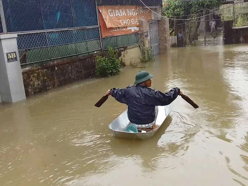 Người dân ở khối 15, phường Bến Thủy, TP Vinh, Nghệ An đi thuyền trong phố. Ảnh: ĐẮC LAM