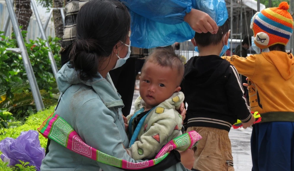Phút nghỉ lấy sức của mẹ và con bên đường rồi tiếp tục hành trình về quê hương.