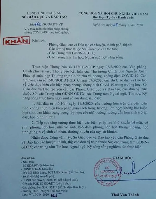 Chiều 8-5, ông Thái Văn Thành, Giám đốc Sở GD&ĐT tỉnh Nghệ An, đã ký công văn khẩn về thực hiện các biện pháp phòng, chống dịch COVID-19 trong trường học trên địa bàn tỉnh.