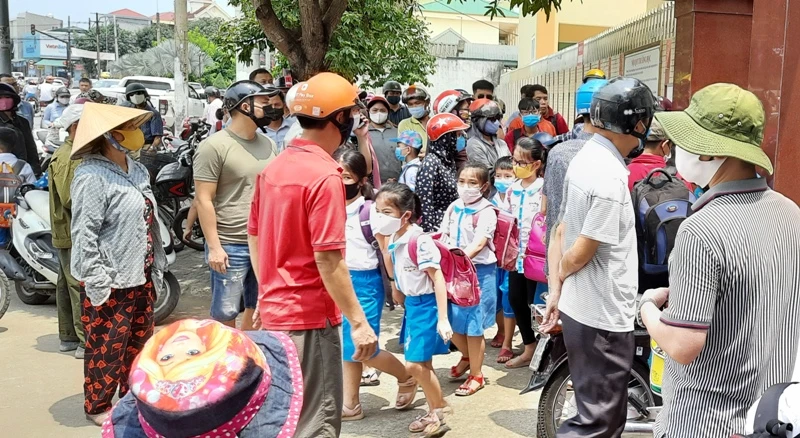 Phụ huynh ở TP Vinh (Nghệ An) đón con trước cổng trường dưới nắng nóng gay gắt.