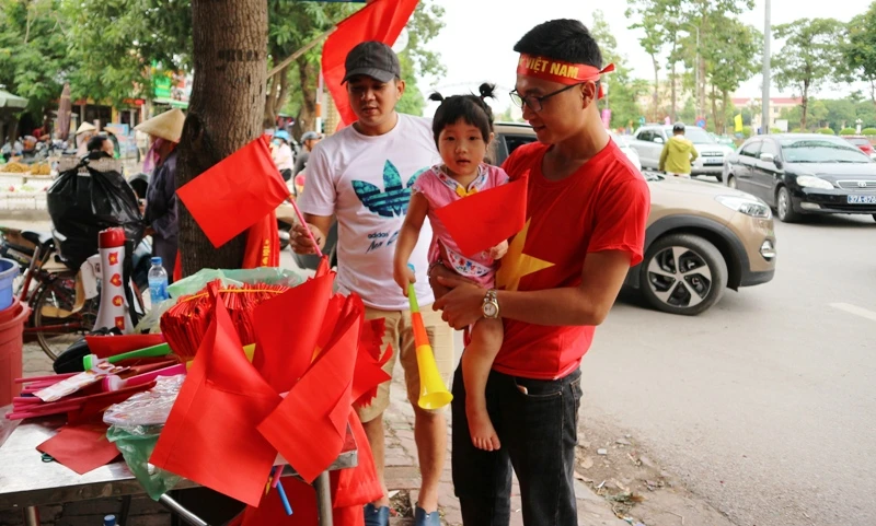 Hiện tại TP Vinh, không khí cổ vũ cho trận Việt Nam-Syria đang nóng dần lên, nhiều người đã đi mua cờ Tổ quốc, loa, kèn, băng rôn để chuẩn bị cổ vũ, diễu hành.