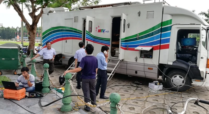 Cán bộ, nhân viên Đài Truyền hình Nghệ An chuẩn bị tường thuật trực tiếp.