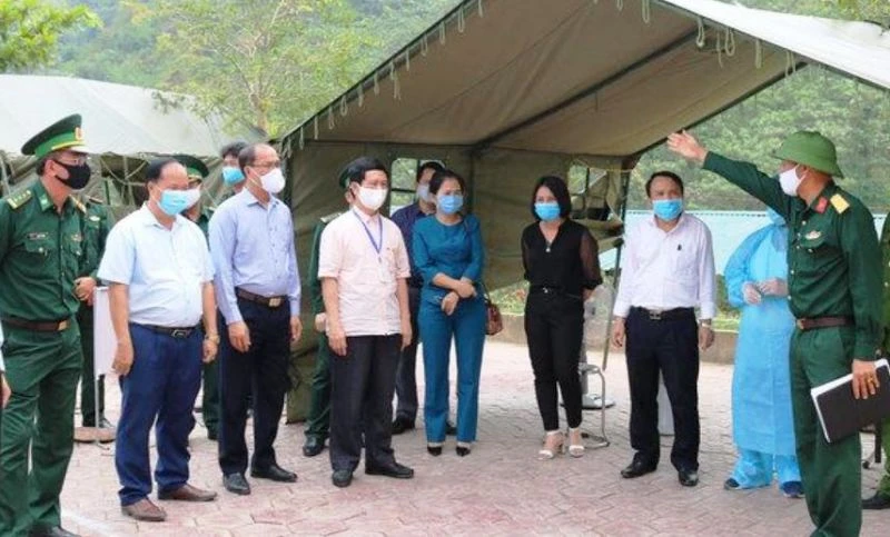Chiều 27-3, ông Nguyễn Xuân Sơn, Phó Bí thư Nghệ An và ông Dương Đình Chỉnh, Giám đốc Sở Y tế kiểm tra việc phòng chống dịch tại Kỳ Sơn. Ảnh: ĐL.