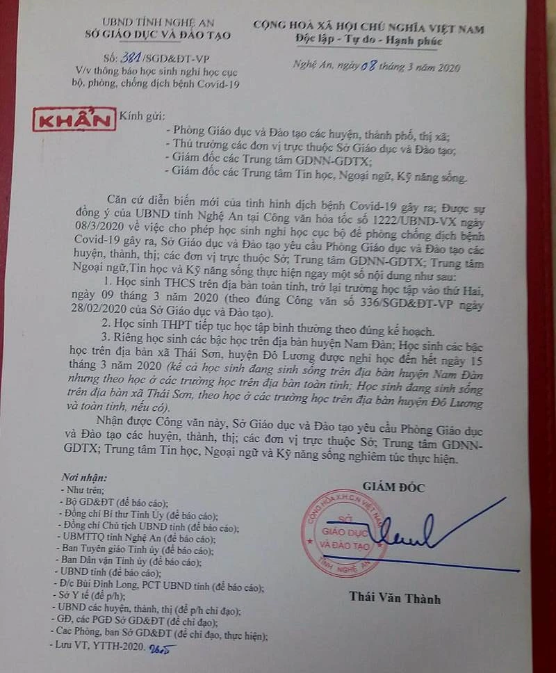 Công văn khẩn của Sở GD&ĐT tỉnh Nghệ An.