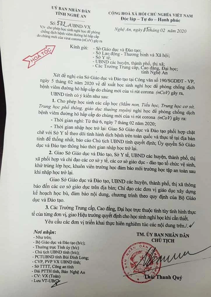 Chiều 5-2, ông Thái Thanh Quý, Chủ tịch UBND tỉnh Nghệ An, đã thay mặt UBND tỉnh Nghệ An ký công văn hỏa tốc cho phép học sinh trên địa bàn tỉnh nghỉ học để phòng, chống dịch do virus Corona.