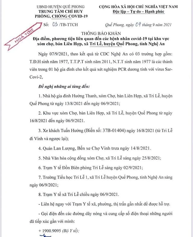 Chiều 7-9, Trung tâm Chỉ huy phòng, chống dịch COVID-19 huyện Quế Phong đã có văn bản hỏa tốc, thông báo khẩn về địa điểm, phương tiện liên quan đến các bệnh nhân COVID-19 ở xóm Chợ.