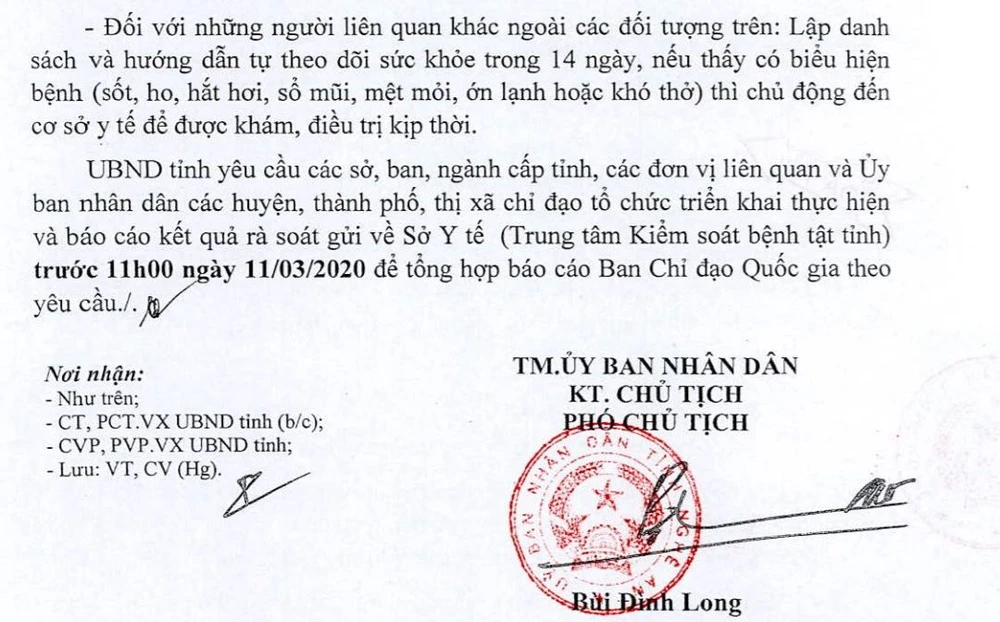 Đối với UBND các huyện, thành phố, thị xã khẩn trương tổ chức điều tra, xác định nơi lưu trú, cư trú của tất cả những người đã tiếp xúc với các trường hợp đi trên chuyến bay nêu trên để có hướng dẫn theo dõi sức khỏe kịp thời, thực hiện khai báo y tế theo mẫu và tổ chức cách ly y tế theo quy định. Đối với những người tiếp xúc gần trường hợp dương tính với COVID-19 phải tổ chức cách ly ngay tại cơ sở y tế trong vòng 14 ngày đồng thời lấy mẫu bệnh phẩm để xét nghiệm.