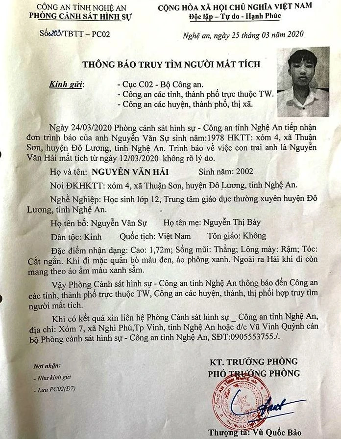 Ngày 25-3, Thượng tá Vũ Quốc Bảo, Phó Trưởng phòng Cảnh sát hình sự, Công an tỉnh Nghệ An, đã ra công văn thông báo tìm người mất tích gửi Cục C02, Bộ Công an, công an các tỉnh, thành phố, công an các huyện, thị xã phối hợp tìm Hải.