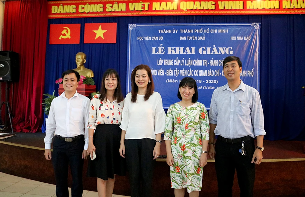 Bà Đoàn Nguyễn Thùy Trang, Phó Chủ tịch Hội Nhà báo TP.HCM (thứ hai từ phải sang), làm giáo viên chủ nhiệm cùng ban cán sự lớp ra mắt học viên. Ảnh: T.TUYỀN