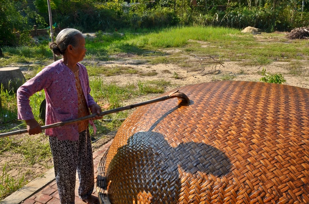 Khi lớp phân bò đã khô, người thợ quét thêm lớp dầu rái (nấu từ nhựa đường, xốp...), hoàn thiện công đoạn chống thấm. Ảnh: TẤN VIỆT