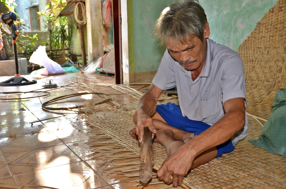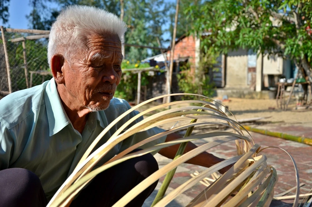 Ông Phan Văn Đông hiện là thợ đan thuyền thúng lớn tuổi nhất làng Hà Bình. Ảnh: VÕ THỊNH