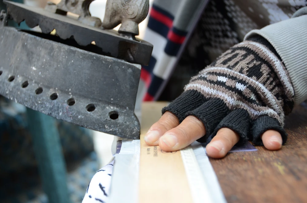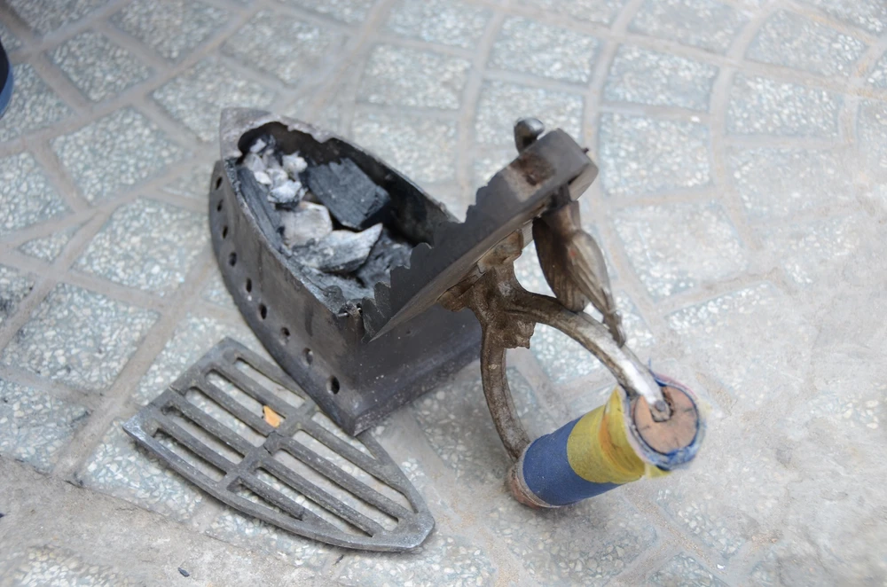 “Cần câu cơm” của bà chỉ là cái bàn ủi con gà có từ thời Pháp thuộc cùng với cái tủ nhỏ và cây thước gỗ. Hiện nay, bà Nhung cũng là một trong những số ít người ở Sài Gòn làm nghề ép giấy tờ bằng bàn ủi con gà.