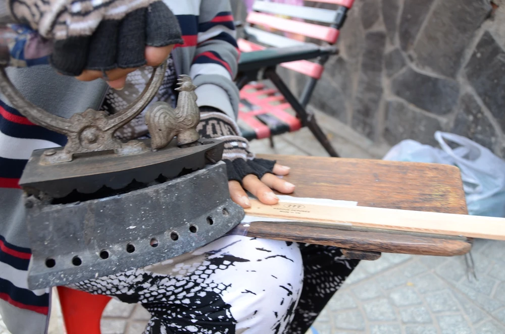Hằng ngày bà Trương Thị Hồng Nhung (54 tuổi, ngụ Q.Bình Thạnh) chọn cho mình một góc vỉa hè, bên hông nhà thờ Thị Nghè (Q.Bình Thạnh, TP HCM) để “hành nghề”. Bà Nhung cho biết, và những năm 1980 khi mới đến Sài Gòn không có nghề ngỗng gì. Tình cờ nhìn thấy một người ép giấy tờ bằng bàn ủi con gà và bà bắt đầu học theo từ đó.