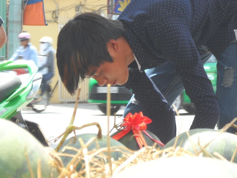 Anh Đào Trung Hiếu đang lựa dưa cho khách. Ảnh: NGUYỄN TRÀ