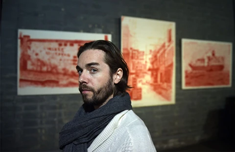 Alexandre Ouairy chụp ảnh trước các bức họa của “nghệ nhân Tao Hongjing” khi sắp khai trương triển lãm tại Red Gate Gallery tại Bắc Kinh, Trung Quốc. Ảnh: AFP